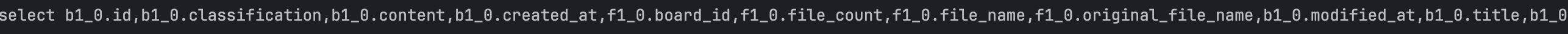sql 이 게시물과 연관된 게시물 파일 조회물임이 단번에 확인됐다. 그래서 게시물 파일 테이블을 게시물 조회할 때 같이 조회하도록 fetchJoin을 사용하고 게시물 중에서 file 이 없는 게시물이 있으면 inner join 을 하면 조회가 되지 않기 때문에 left join 을 사용해서 해결